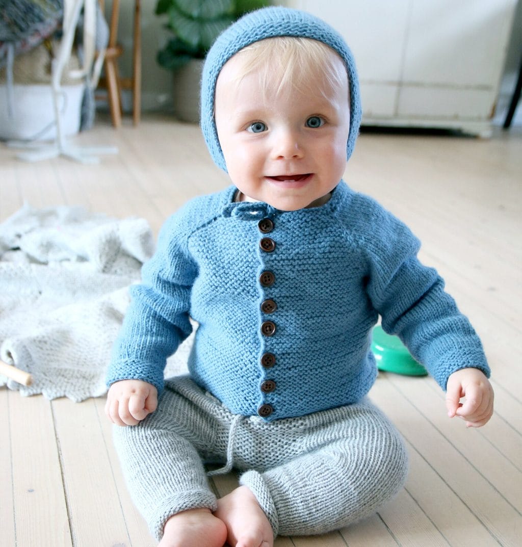 Lille rille-serien er også en klassisk serie med mange forskjellige plagg, men vi er kanskje spesielt glad i denne enkle jakken med lue til. Veldig enkle å strikke, spesielt jakken, og plaggene strikkes i Pickles Mjuk Merino som nok er det garnet vi bruker aller mest til babyer og barn.