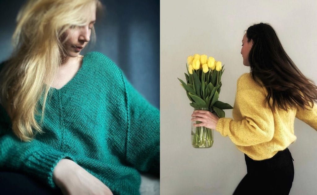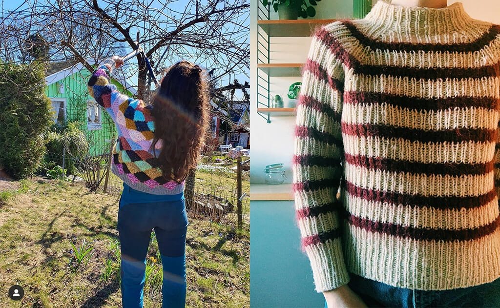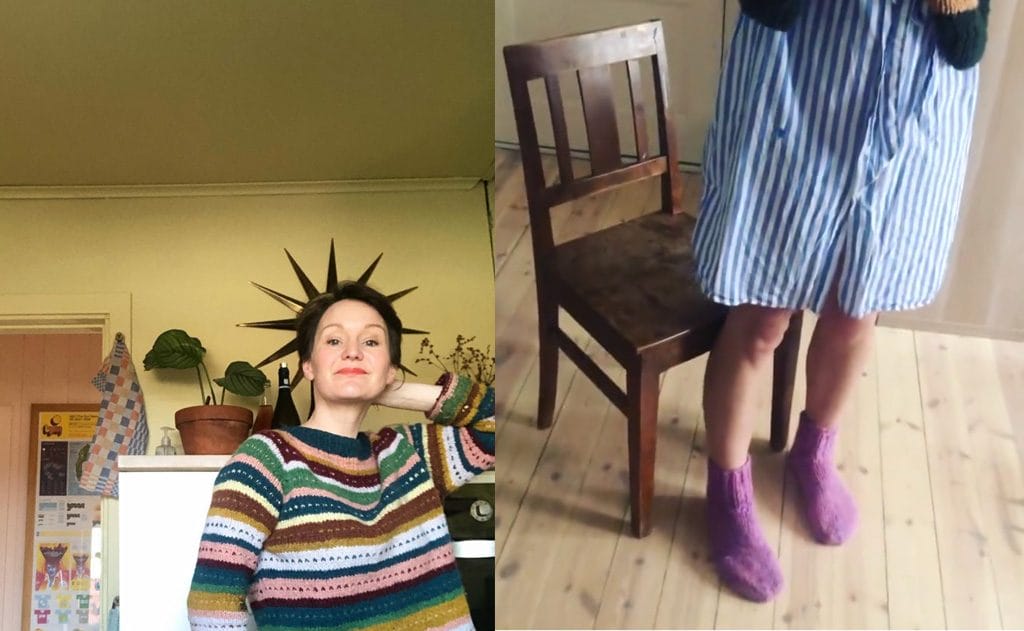 Arvingensmasker og Stallevalle i hhv Pangolin og Twiggy. Vi synes å ane at mange går for farger om dagen. For å putte litt «yey» inn i hverdagen kanskje? Disse antrekkene ble vi glade og begeistra av. Consutum (som dere burde følge for å lese hennes daglige dose Lockdown-tanker) og hennes tvillingsøstre Consitrus, kjører også farger (How deep is your v og Drømmegenser), og vi får umiddelbart lyst til å legge opp noe i en sterk, glad farge!