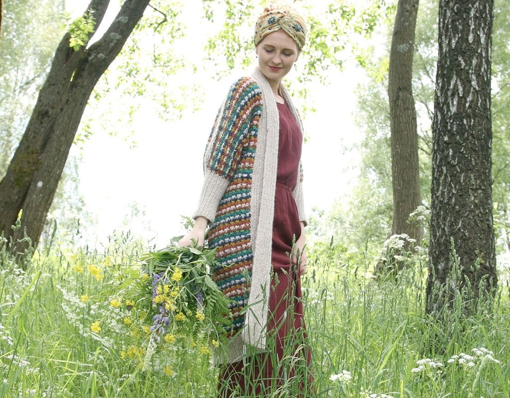 Denne jakken er virkelig en fest av en jakke. Den er strikket på tjukke pinner, noe som gir et ganske luftig stoff, like perfekt å slenge over en kjole, i sofaen vinterstid eller til shortsen når det skyer over sommerstid. Vi har også laget en kort, ensfarget variant så man kan fint bruke færre farger om man ønsker et roligere uttryk!
