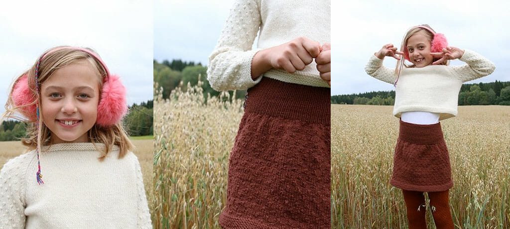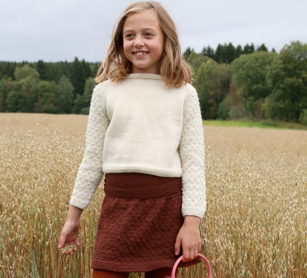 Dotter er gøy i alle aldre, og her har vi brukt små dotter som pynt både på genser og på skjørt. Små dotter tett-i-tett gir en spennende struktur, og da er det veldig fint å kombinere med glattstrikk, slik som det er gjort her!