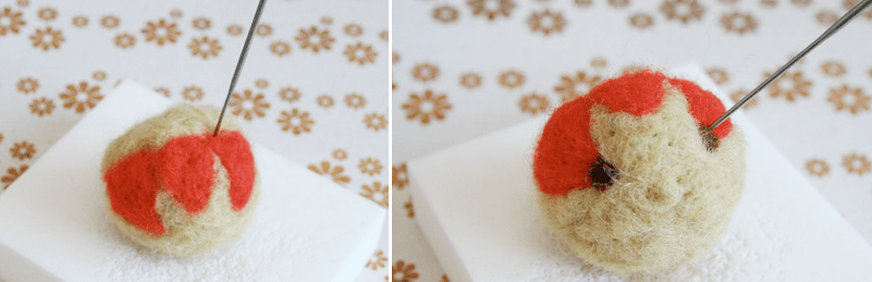 3. Make red triangles for the head. Shape the wool into triangle shapes, and work them with the needle just a little bit.