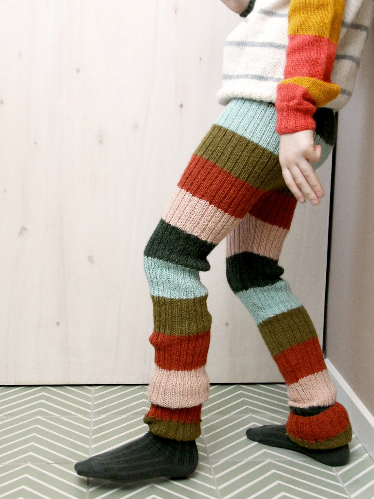 Størrelser: 1 (2) 3-4 (5-6) 7-8 (9-10) 11-12 (13-14) år | Garn: Pickles Bliss: 50 (50) 50 (50) 50 (100) 100 (100) g hver av 5 ulike farger | Pinner: 40, 60 eller 80 cm rundpinne og settpinner 3 mm | Strikkefasthet per 10 cm: Ribbestrikk: 40 masker / 35 rader | Mål, liggende flatt: Passer hoftemål: 52 (56) 60 (68) 72 (76) 80 (84) cm. Livvidde (strekkes ut): 17 (18) 19,5 (22) 23,5 (25) 26 (27) cm. Lengde: 48 (53) 60 (67) 72 (82) 87 (92) cm | Litt øvet / Buksa strikkes ovenfra og ned med vendinger bak.