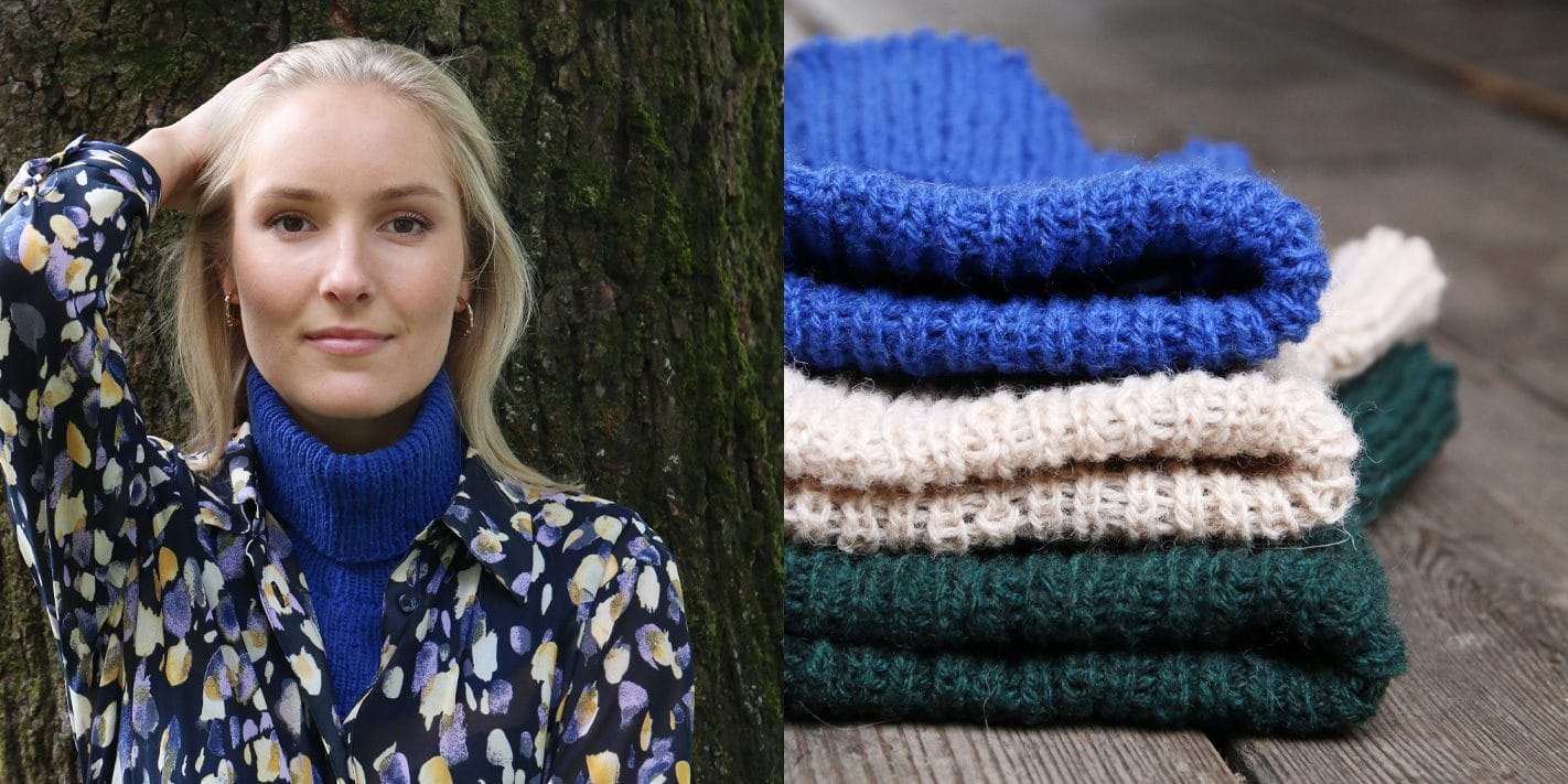 Til høyre har sjefen sjøl @picklesheidi på den originale Estyhalsen, her i den superklassiske fargen Malte mandler.
