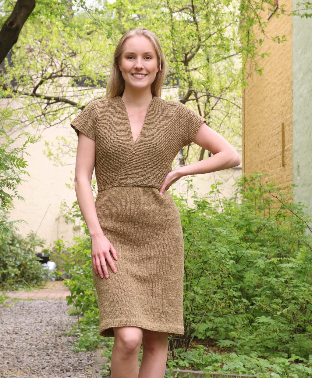 Den perfekte varm sommerdagkjolen. Den er romslig og behangelig i den snilleste plantefargede, økologiske bomullen. At den henger så fint på skuldrene og har litt puffermer gjør den bare enda finere. Siden den er strikket fra toppen og ned er det enkelt å tilpasse lengden så den blir helt perfekt for den fine frøkna som skal bruke den!
