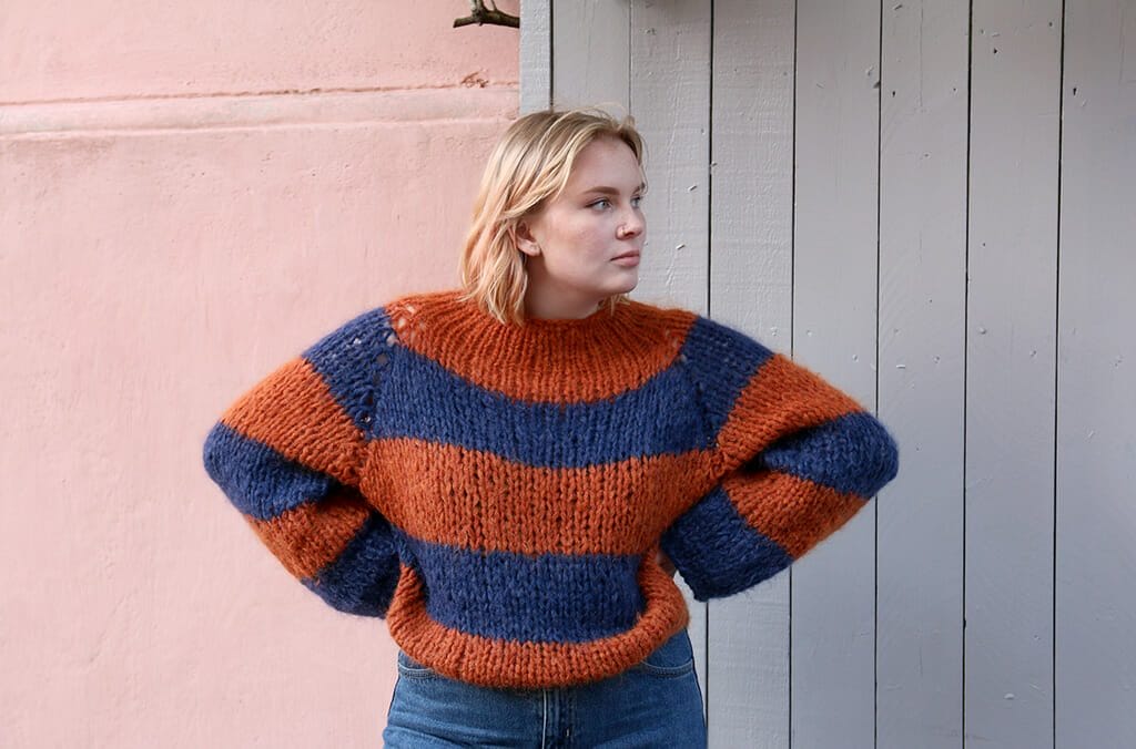 Designet Tykk genser – en skikkelig varm og deilig genser, her i striper i kontrastfarger. Heidi strikket denne på toget Oslo-Trondheim, så denne går kjapt! Hun har brukt Pickles Cozy holdt sammen med Pikcles Big Fuzz. Lag deg gjerne en lue av restene!